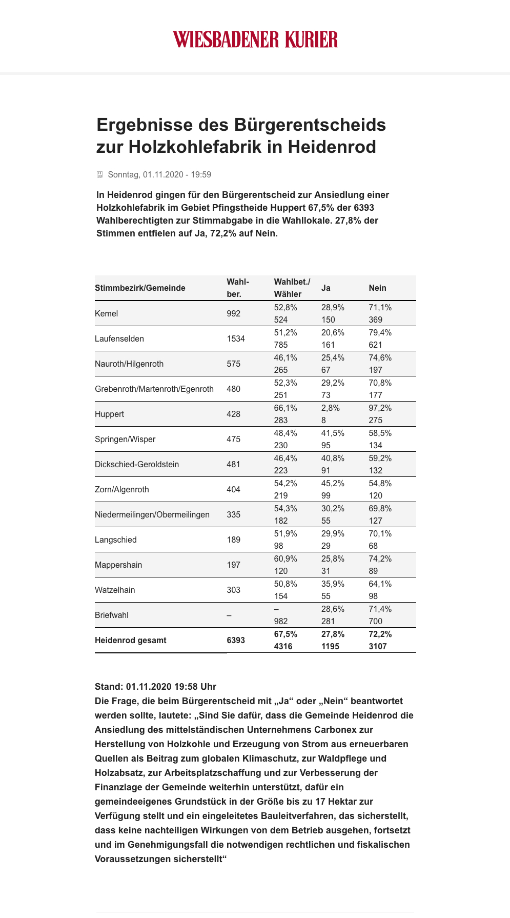 Mehr als 3.100 BürgerInnen von Heidenrod haben die Ansiedlung der Holzkohlefabrik abgelehnt, das sind 72,2% der Wahlbeteiligten.